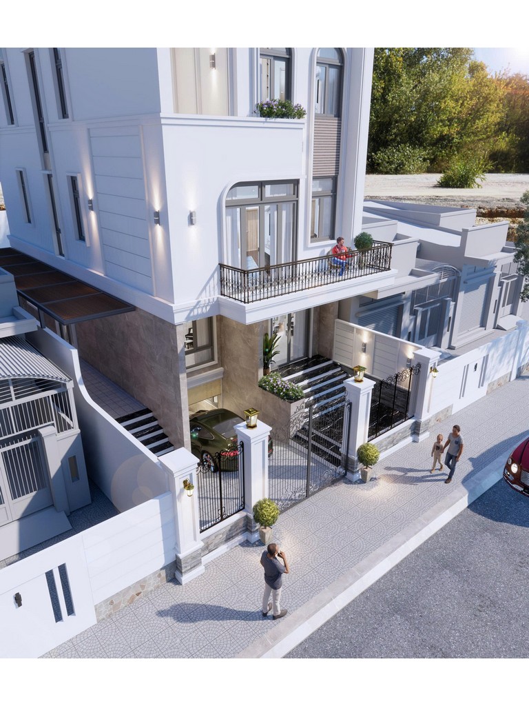 Nhà Phố Tân Cổ Điển Có sự kết hợp giữa các chi tiết phào chỉ nhẹ nhàng và ban công sắt nghệ thuật, tạo vẻ sang trọng tiện nghi. Các căn nhà có diện tích mặt tiền rộng, yêu cầu sự tinh tế và đẳng cấp.