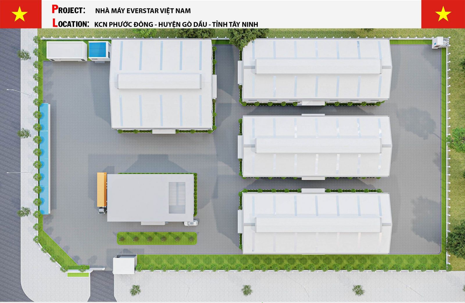 Nhà máy EverStar Việt Nam với quy mô xây dựng là: 7,900 m2 trên diện tích khu đất 11,300 m2 bao gồm Nhà xưởng, Nhà văn phòng, bãi để xe, khu xử lý nước thải, bể nước ngầm PCCC cùng phòng bơm,…